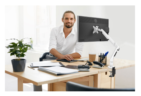 Ramie uchwytu na monitor może być regulowane w zależności od preferencji Użytkownika. Dzięki temu, można dostosować wysokość, odległość oraz kąt nachylenia monitora, aby uzyskać optymalne ustawienie dla wygody użytkowania. Dzięki takiej regulacji można zminimalizować negatywne skutki pracy przed monitorem, takie jak zmęczenie oczu i szyi.