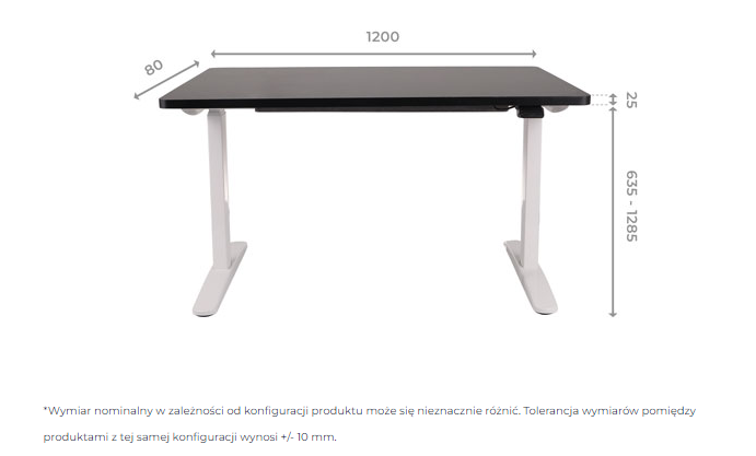 Panel umożliwia płynne sterowanie wysokością biurka w zakresie od 635 mm do 1285 mm.