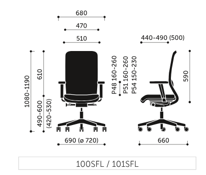 P48PU - podłokietnik regulowany góra-dół (zakres regulacji 100 mm), nakładka obrotowa (+/- 30°), nakładka przód-tył (+/- 30 mm), regulacja odległości od siedziska (zakres regulacji 35 mm na stronę, nakładka poliuretanowa. Kolor stelaża podłokietnika: czarny.