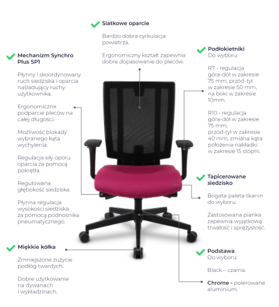 MaxPro wyposażony wyposażony jest w mechanizm ruchowy Synchro Plus. Po zwolnieniu blokady wybranej pozycji, oparcie wychyla się w ruchu skoordynowanym z siedziskiem naśladując ruch Użytkownika w fotelu, gwarantując mu podparcie pleców w każdej pozycji.