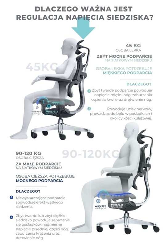 Dzięki tym regulacjom Twój kręgosłup ma większą swobodę ruchu, a zmiana kąta siedziska i oparcia w kierunku ujemnym pozwala na uniknięcie sztywności mięśni, bólów pleców oraz poprawia krążenie krwi. Dodatkowo taka pozycja zmniejsza ucisk na stawy biodrowe i kolanowe, co jest korzystne dla osób, które spędzają dużo czasu w jednej pozycji.