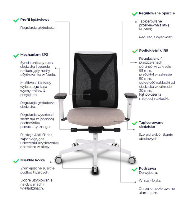 Prezentowana wersja WS oznacza, że elementy konstrukcyjne zostały wybarwione na kolor biały (W), a oparcie jest tapicerowane siatą Runner (S)