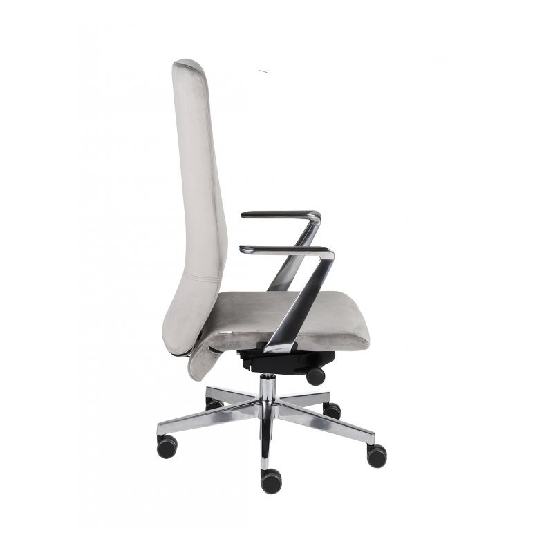 Pięcioramienna podstawa jezdna wykonana z aluminium polerowanego do koloru chrome wyposażona w czarne kółka miękkie 60mm (odpowiednie do parkietów i paneli).