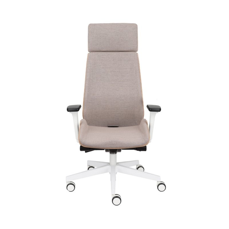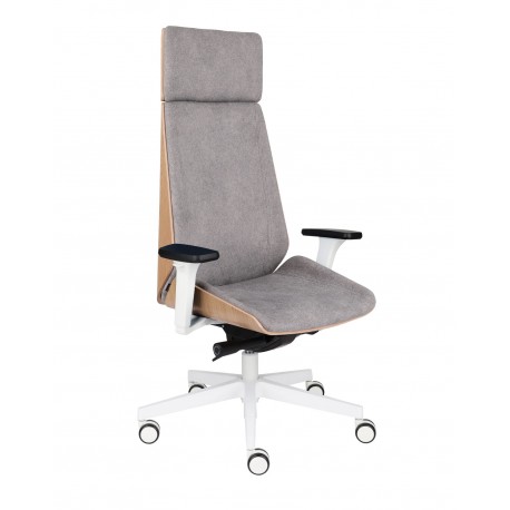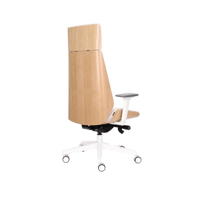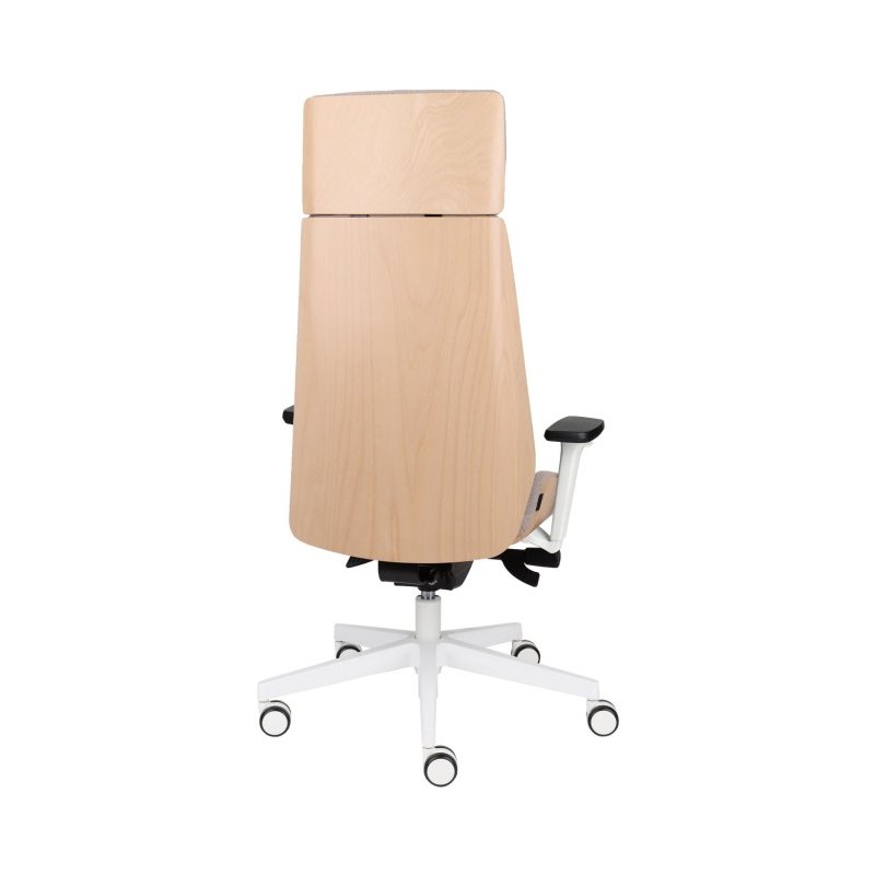 Nowa odsłona fotela Moon Wood HD White - drewno bukowe marki Grospol, z białymi elementami konstrukcyjnymi, wyposażona w komfortowy zagłówek.