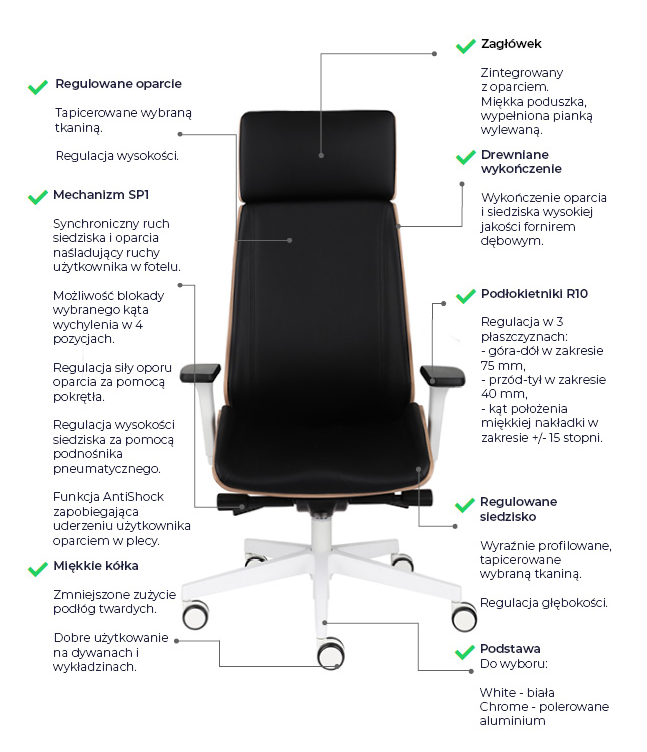 Modernistyczne kształty w połączeniu z klasycznym wykończeniem sprawia, że fotel idealnie wkomponuje się we wnętrze kancelarii prawniczej czy biurach kadry zarządzającej.