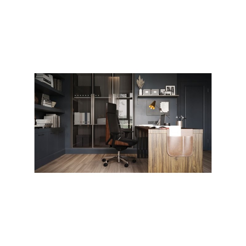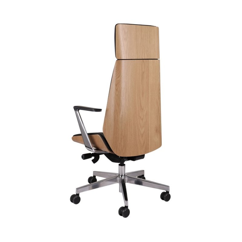Połączenie drewnianych elementów fotela z polerowanym aluminium sprawia, że fotel wygląda bardzo ekskluzywnie. Idealnie wkomponuje się we wnętrza gabinetowe i konferencyjne, a także w domowe strefy home office. Pomimo stałych podłokietników fotel posiada szereg rozwiązań ergonomicznych. Regulacja wysokości oparcia odbywa się bez wstawania z fotela.