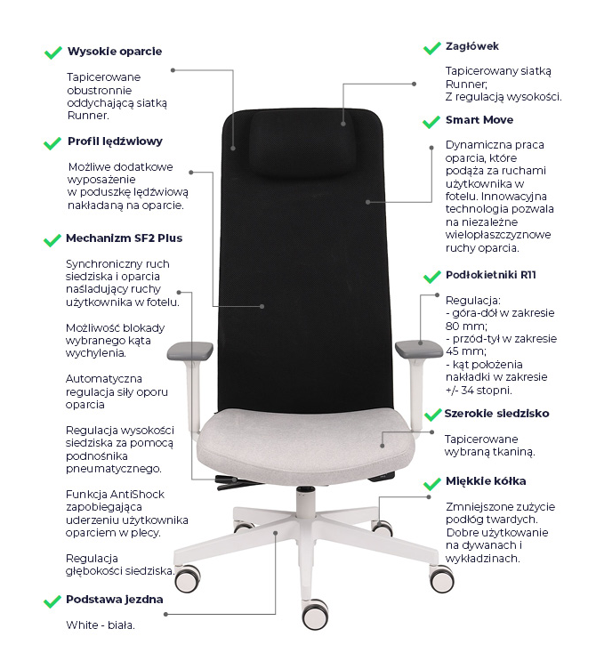 Fotel Mike 2 W to fotel zaprojektowany i produkowany w Polsce! Druga odsłona serii Mike - z innowacyjną funkcją Smart Move oraz siatkowym zagłówkiem.