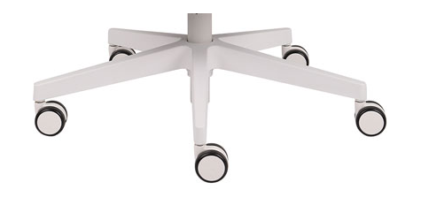 Pięcioramienna biała nylonowa podstawa jezdna wyposażona jest w kółka miękkie przystosowane do bezpiecznej pracy na parkiecie, panelach
