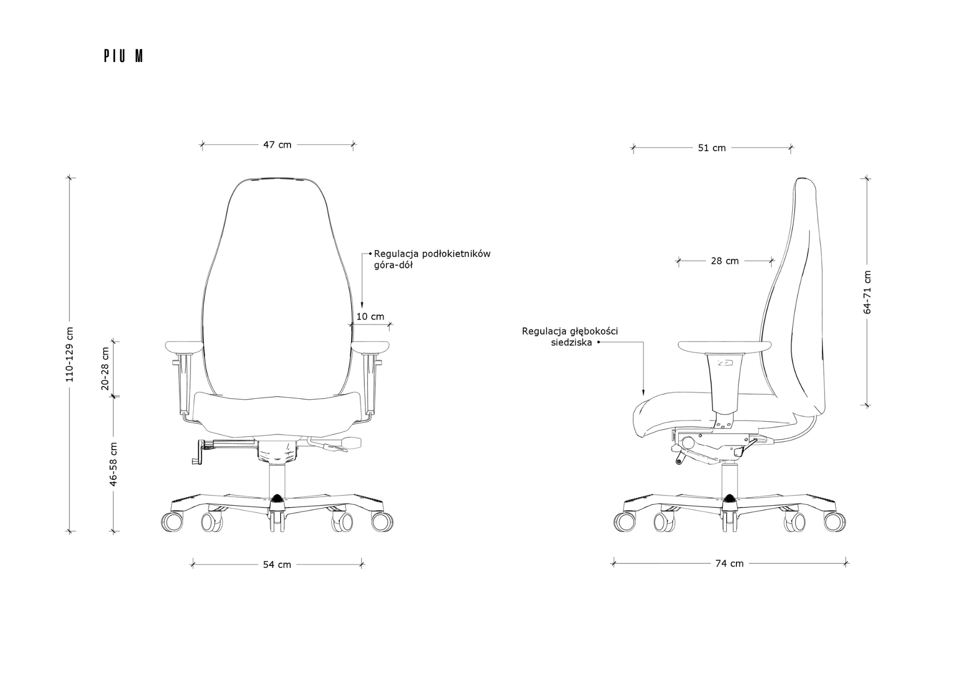 Fotel Piu M oferuje szereg regulacji, które pozwalają dostosować go do różnych potrzeb i sylwetek. Użytkownik może swobodnie ustawić wysokość siedziska, kąt odchylenia oparcia oraz pozycję podłokietników, co przekłada się na większy komfort podczas pracy.