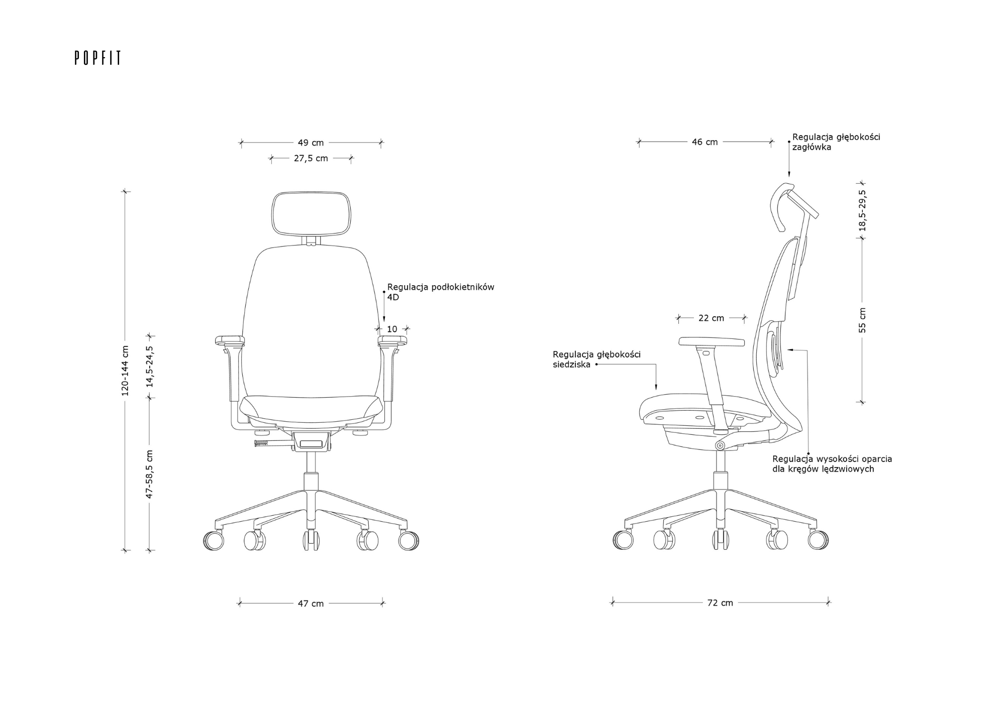 Krzesło Popfit to nowoczesne, ergonomiczne krzesło biurowe zaprojektowane z myślą o komforcie nawet podczas wielogodzinnej pracy. Szeroki zakres regulacji pozwala idealnie dopasować je do indywidualnych potrzeb użytkownika, zapewniając prawidłowe podparcie kręgosłupa i wygodę na najwyższym poziomie.