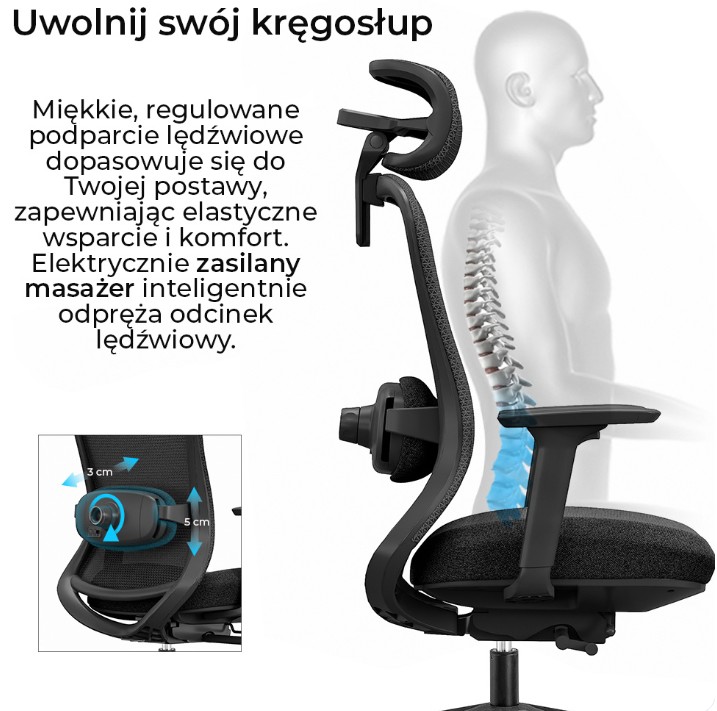Wibrujące podparcie lędźwi zmniejsza napięcie mięśni po długim siedzeniu, wspiera mikrokrążenie i pomaga odciążyć dolny odcinek pleców. Sprawdza się w trakcie krótkich przerw, w końcówce dnia lub po intensywnych zadaniach wymagających skupienia.