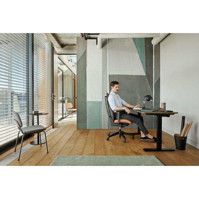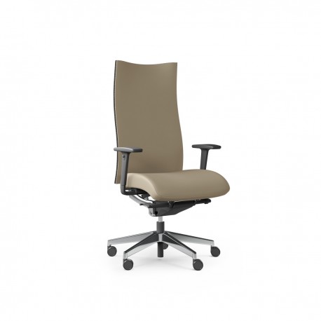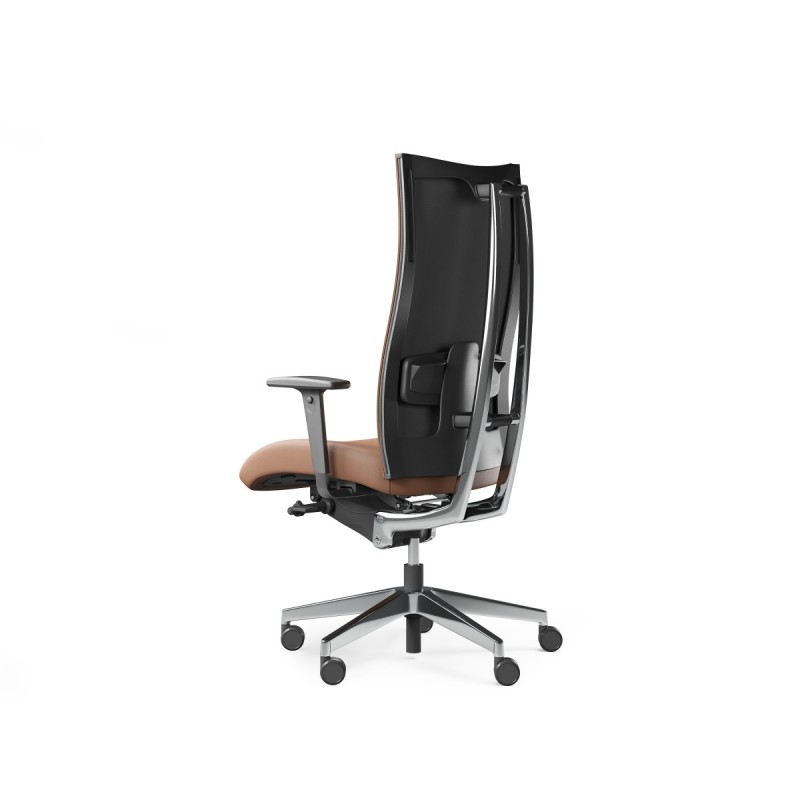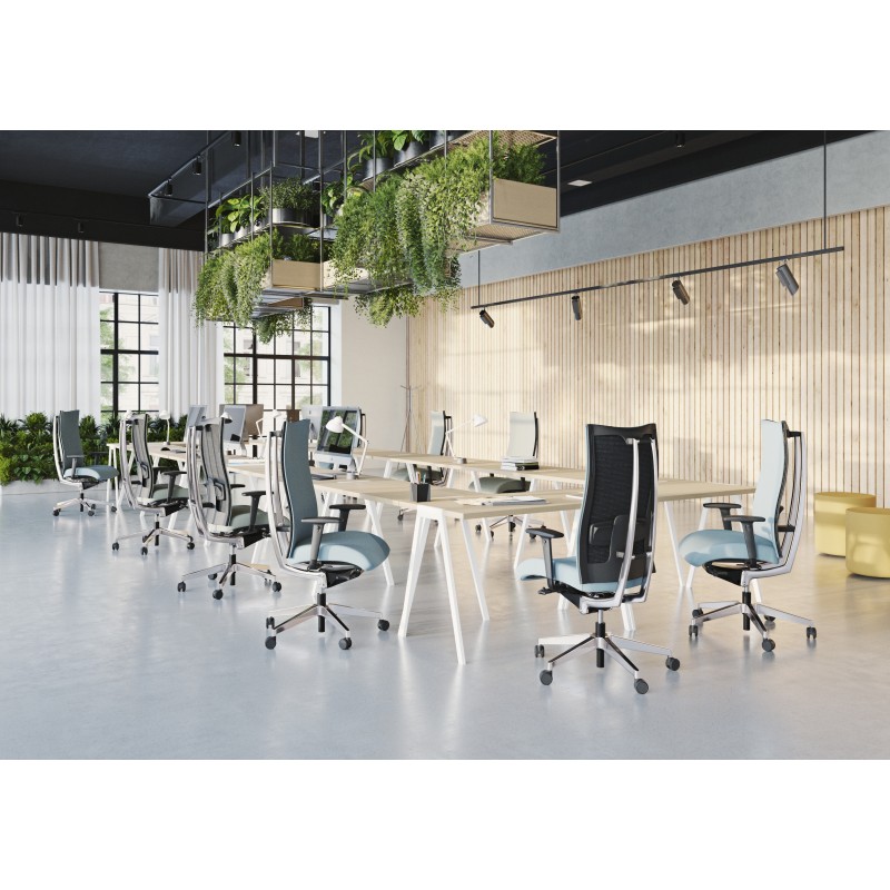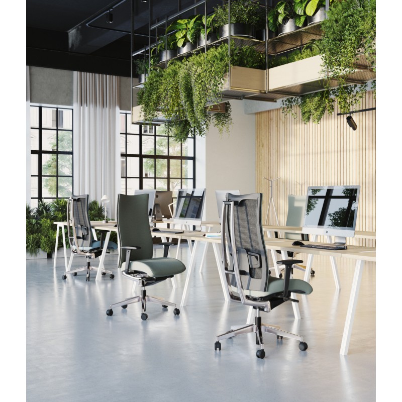 Fotel cechuje wyjątkowo ergonomiczny charakter dzięki możliwości płynnej regulacji kąta nachylenia siedziska i oparcia, dzięki regulowanemu podparciu odcinka lędźwiowego kręgosłupa oraz regulowanym podłokietnikom.