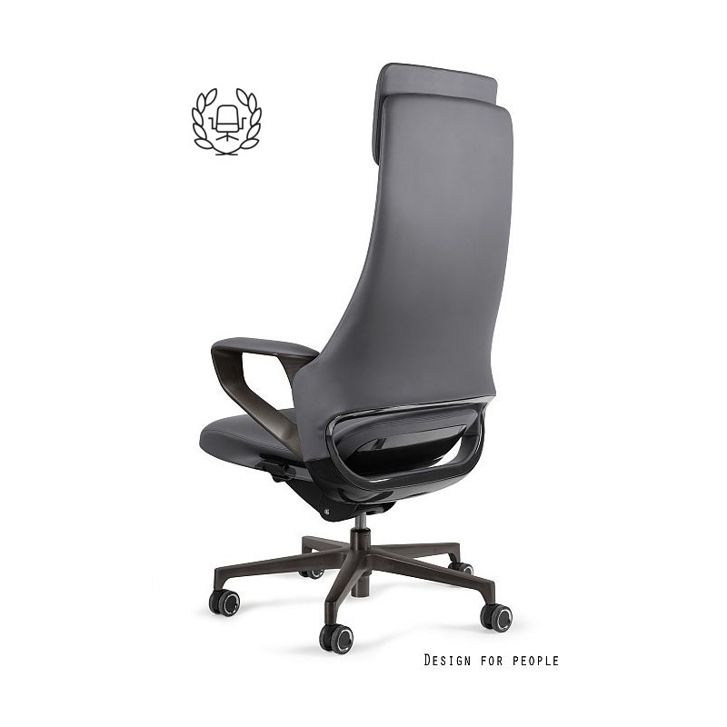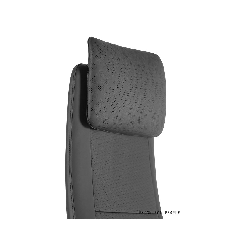 Zagłówek, oparcie i siedzisko tapicerowane eko-skórą w kolorze czarnym lub szarym
