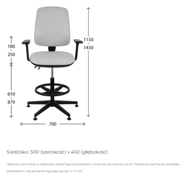 Duży zakres regulacji wysokości siedziska sprawia, że krzesło sprawdzi się przy wysokich ladach, stołach, biurkach, recepcjach.