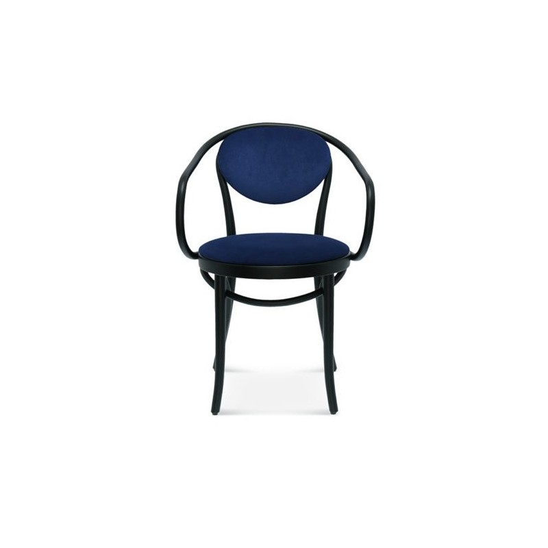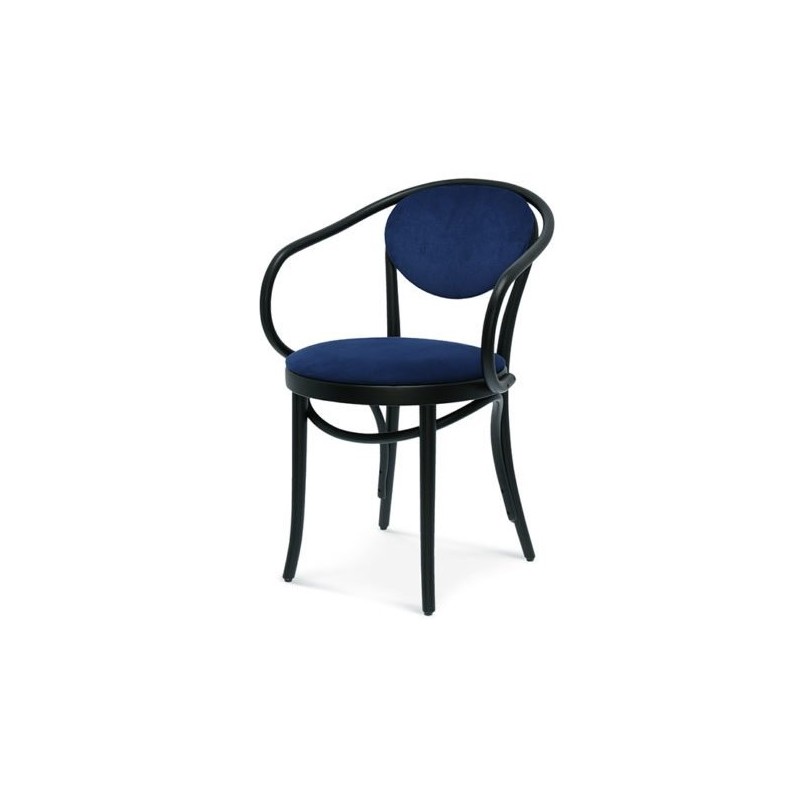 Fotel B-9/1, jego oparcie zostało wykonane z ręcznie giętego drewna, co daje całemu projektowi delikatnie opływowy kształt.