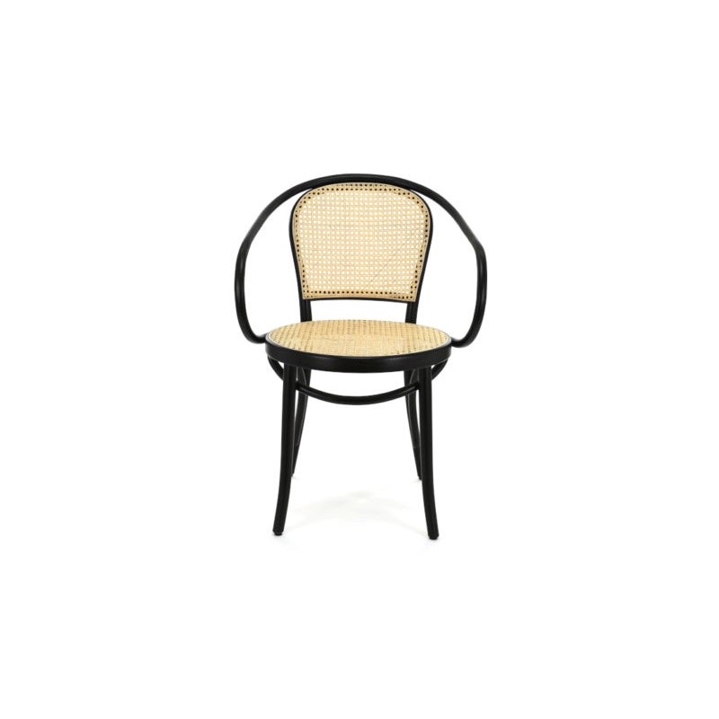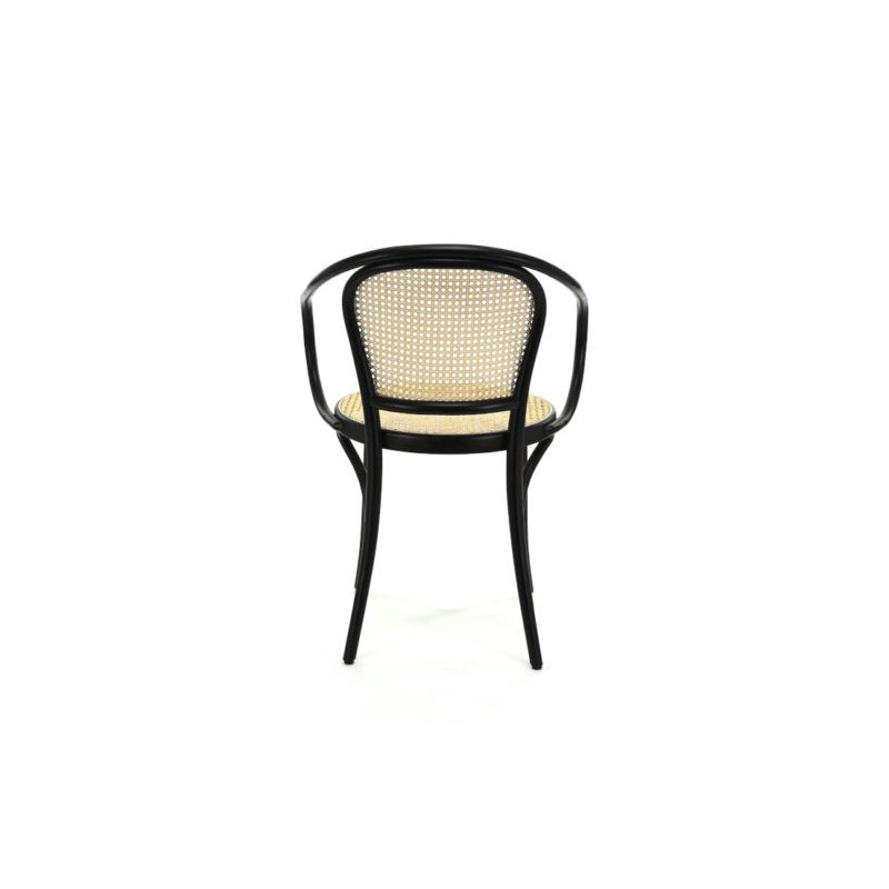 Fotel B-9/3, jego oparcie zostało wykonane z ręcznie giętego drewna, co daje całemu projektowi delikatnie opływowy kształt.