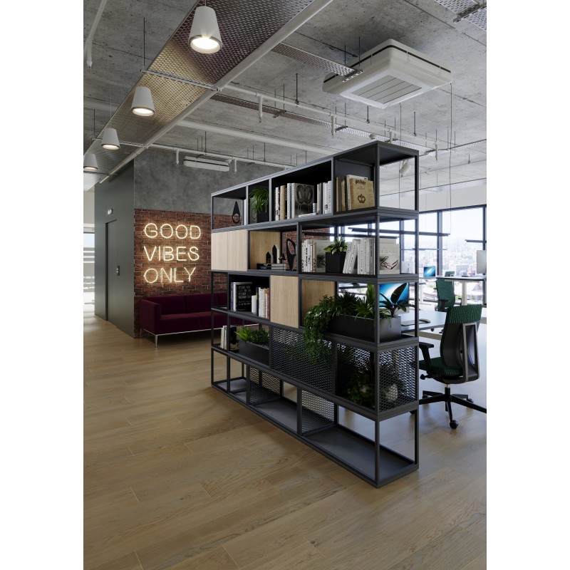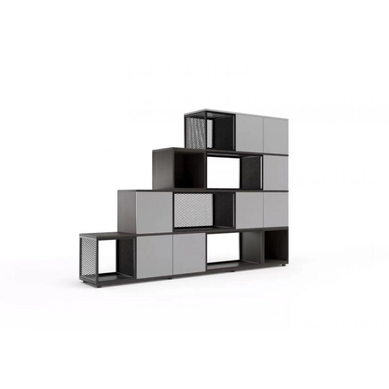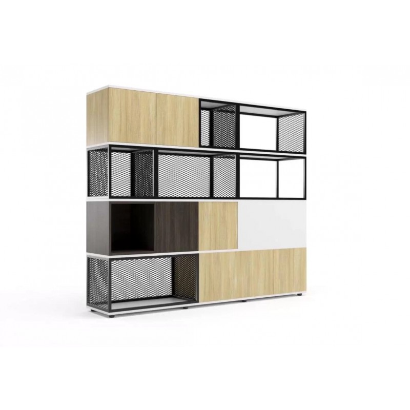 Moduły z płyty melaminowanej grubości 18 mm lub metalowe z siatki metalowej cięto-ciągnionej o prześwicie 54% – wiele możliwości kolorystycznych, profil metalowy 20x20 mm.