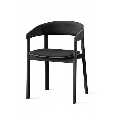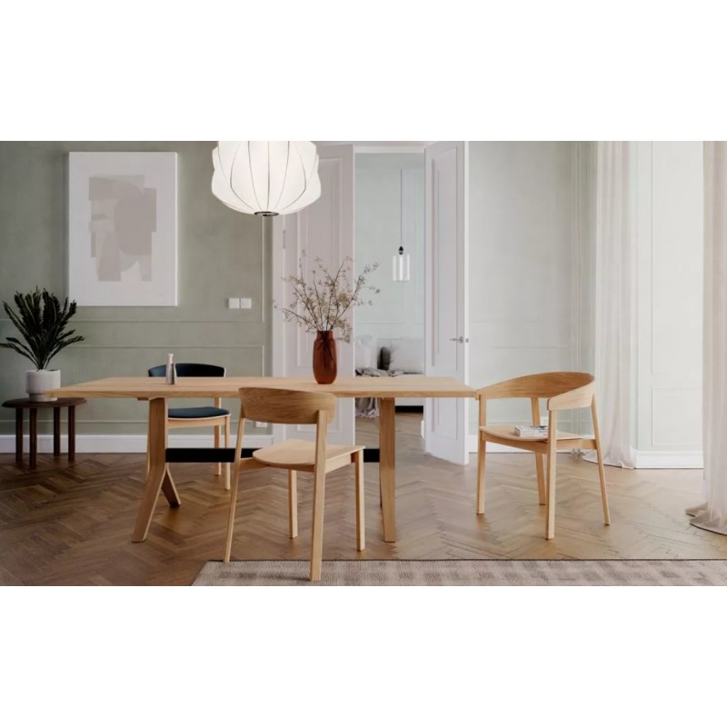 Meble zbudowane są z prostych elementów, a szerokie oparcia fotela i krzesła są lekko zawieszone na elementach konstrukcji. To uproszczona, wyrazista forma o szerokim zastosowaniu.