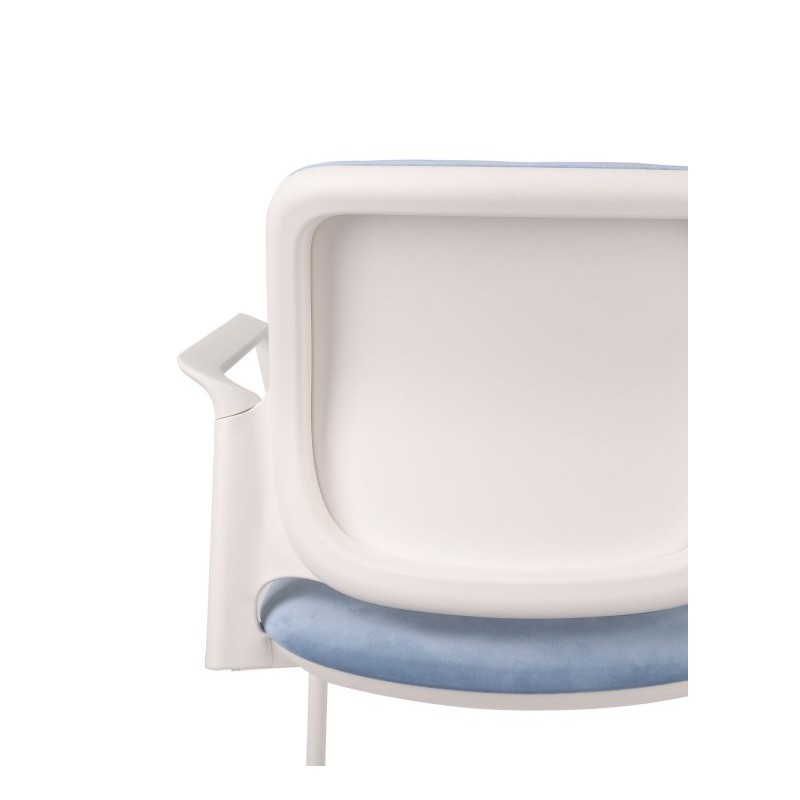 Krzesło posiada podłokietniki stałe (Arm) w kolorze białym, które zapewniają wysoki komfort użytkowania, wspierając ramiona podczas siedzenia.