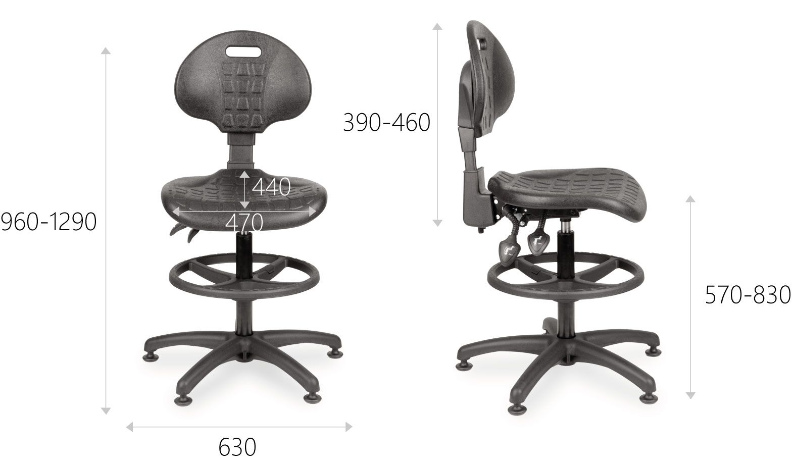 Wysokie krzesło obrotowe z regulowaną podpórką na nogi. Wykonane z wysokiej jakości poliuretanu, które zapewni łatwość w utrzymaniu czystości. Doskonale sprawdzi się do użytku w miejscach o wysokim stopniu zabrudzenia.