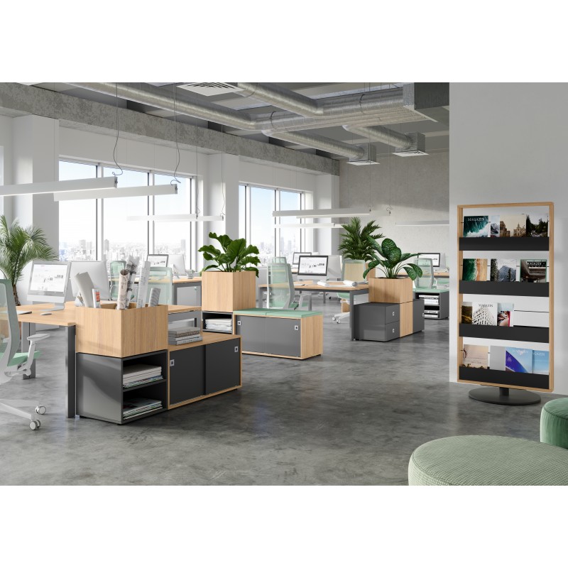 System pozwala na zbudowanie ciągów przybiurkowych, kwietników z siedziskami oraz modułów wolnostojących o dowolnych długościach.
