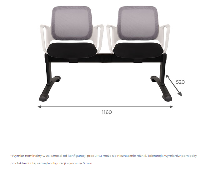 Każde siedzisko ławki posiada podłokietniki stałe (Arm) w kolorze białym, które zapewniają wysoki komfort użytkowania, wspierając ramiona podczas siedzenia.