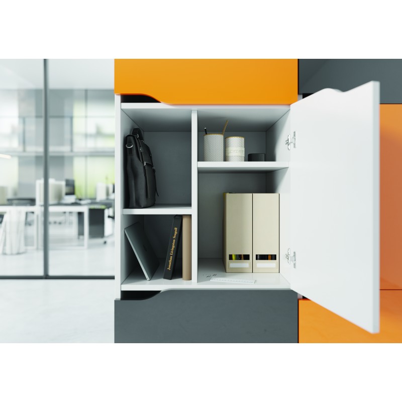 Uniwersalne i jednocześnie nowoczesne szafki biurowe wykonane z płyty melaminowanej, zamykane na kluczyk i wyposażone w zawiasy BLUM 100˚.