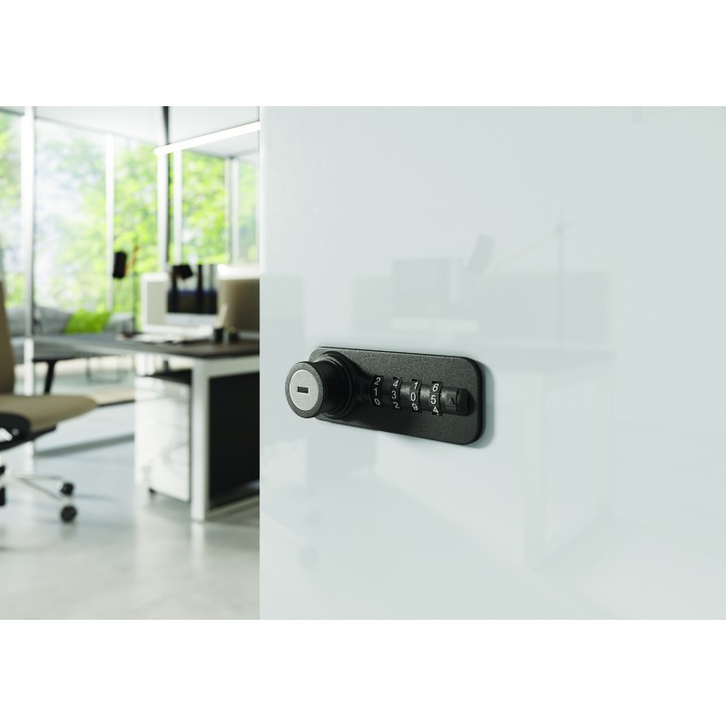 (stosowany w 4S, 5S, 8S, 10S, 4SZ, 5SZ, 8SZ, 10SZ oraz LLC-3S). Zamek wyposażony w trwały mechanizm wykonany w 100% z metalu. Obudowa wykonana z tworzywa w kolorze czarnym. Zamek otwierany za pomocą 4 cyfrowego kodu lub klucza master, z możliwością rozkodowania zamka za pomocą iglicy.