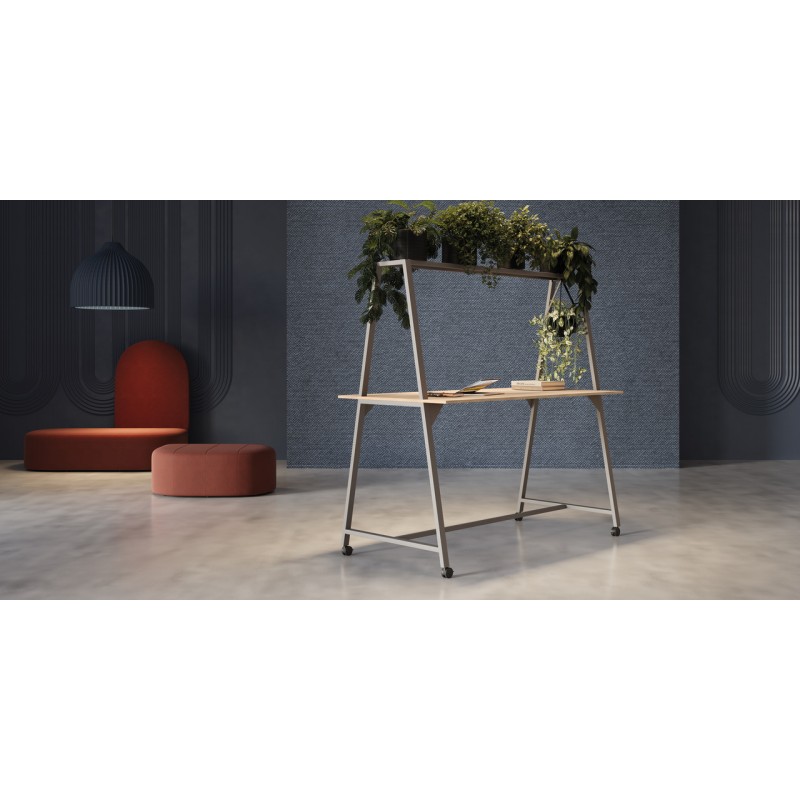 Podwyższona forma stołu sprzyja spotkaniom na stojąco i pracy przy hokerach, a mobilna konstrukcja sprawia, że układ wnętrza można dopasować do rytmu zespołu, a nie odwrotnie.