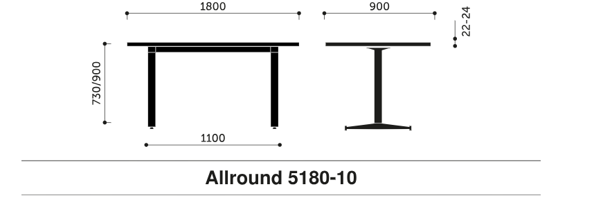 Allround 5180-10 - stół 180 x 90 cm, prostokątny, wysokość 730 mm lub 900 mm, odległość między nogami 110 cm, stelaż T