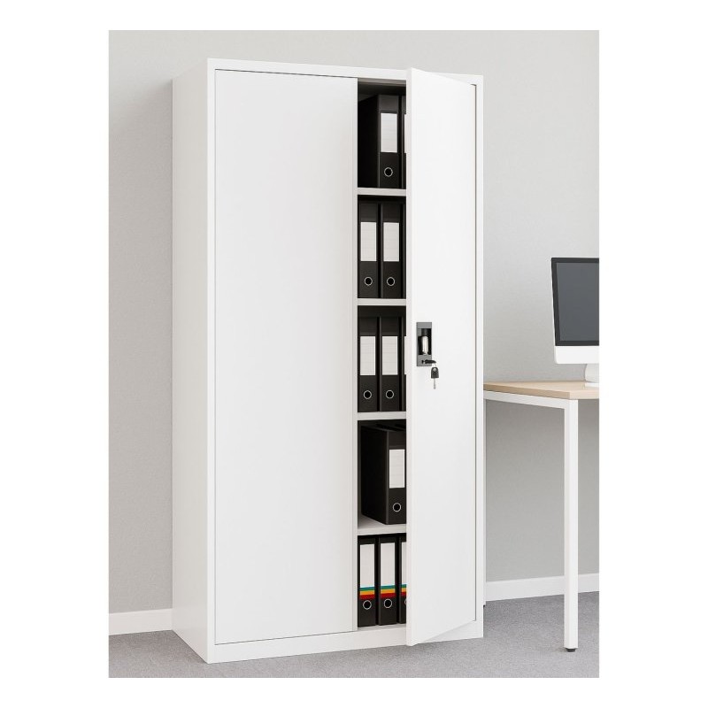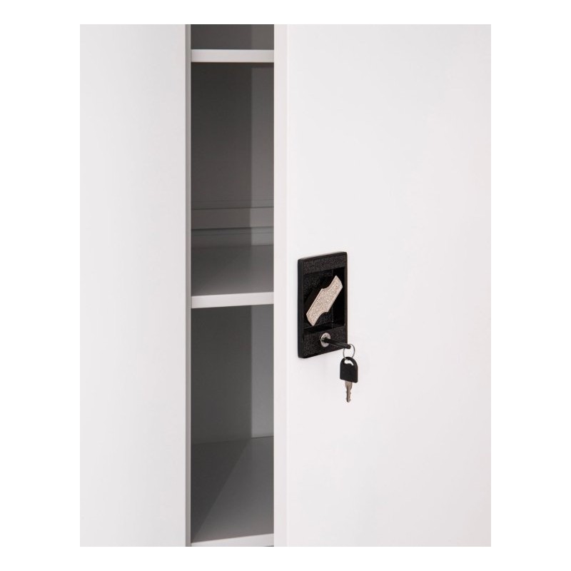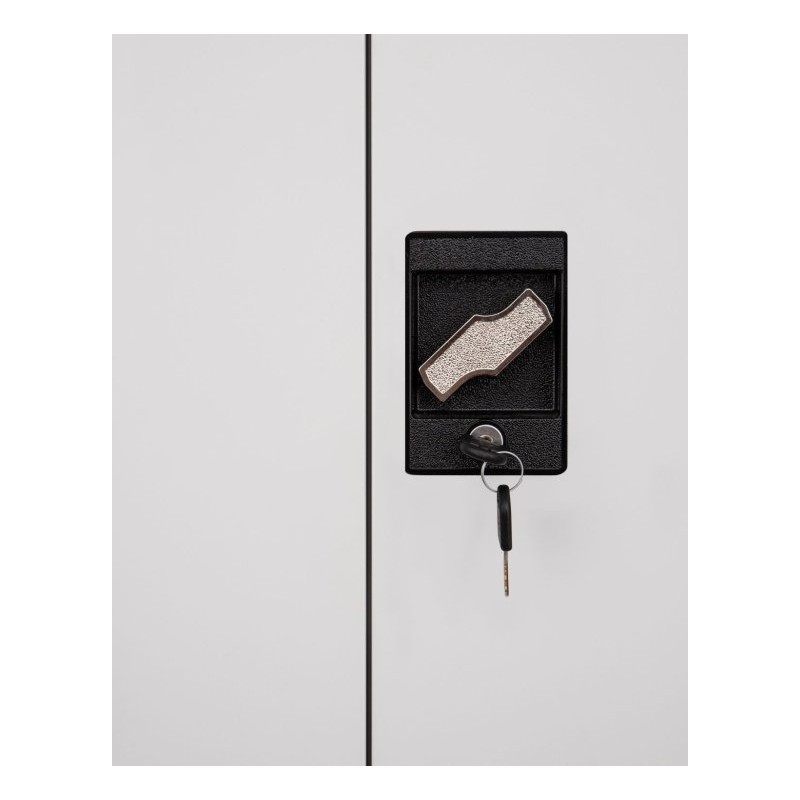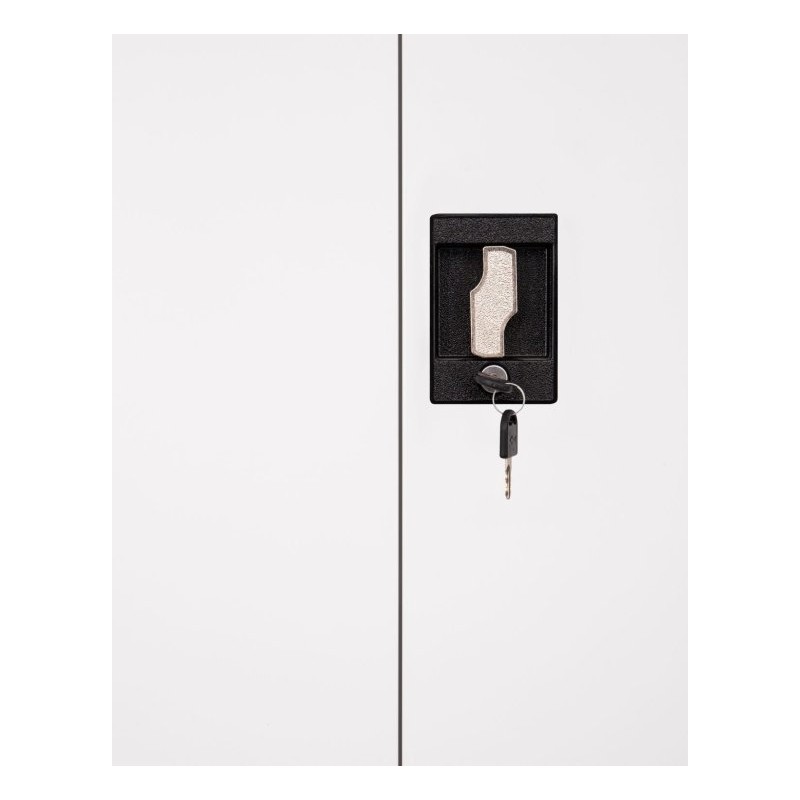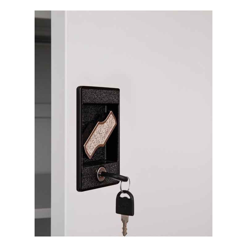 Dla zwiększenia bezpieczeństwa zawartości szafa posiada zamek krzywkowy zamykany na klucz (w zestawie dwa klucze), co chroni dokumenty przed dostępem osób niepowołanych.
